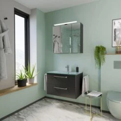 Das Badmöbel-Set Trentino wird mit seinem kubischen, modernen Stil zum Hingucker im Bad und bietet ausreichend Platz für Badutensilien. Es besteht aus einem Waschbecken mit Unterschrank und einem Spiegelschrank mit Beleuchtung. Mit Hochglanzfronten in Anthrazit und formschönen Griffen in Chrom verleiht das Badezimmer-Set einen zeitgemäßen und stilvollen Look. Das kompakte Badezimmermöbel-Set eignet sich auch für Gäste-WCs.