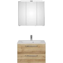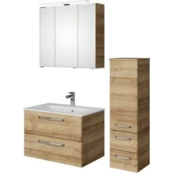 Das Pelipal Badmöbel-Set TrenTino mit Midischrank 107 cm Eiche Riviera bietet eine elementare, bestehend aus den drei Kernkomponenten Waschtisch, Waschtischunterschrank Spiegelschrank und als Beimöbel ein Midischrank. Prädestiniert ist TrenTino für die individuelle kleinerer Bäder. Bad-Set bestehend aus