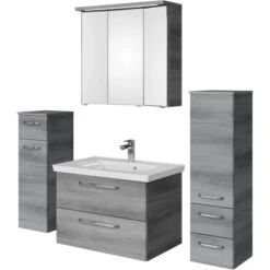 Das Pelipal Badmöbel-Set TrenTino mit Beimöbeln und 3D-Spiegelschrank 140 cm Graphit bietet eine elementare, bestehend aus den drei Kernkomponenten Waschtisch, Waschtischunterschrank Spiegelschrank und als Beimöbel ein Unterschrank und ein Midischrank. Prädestiniert ist TrenTino für die individuelle kleinerer Bäder. Bad-Set bestehend aus