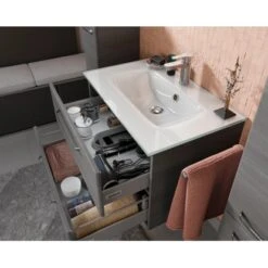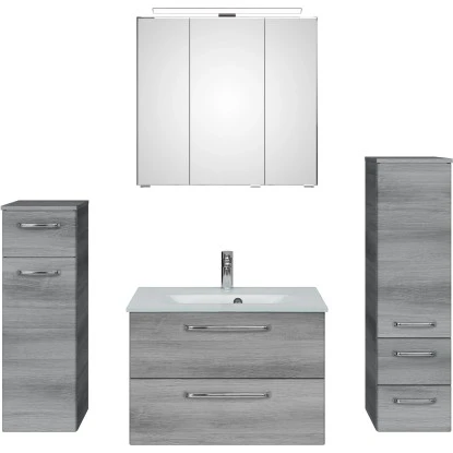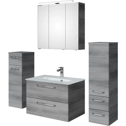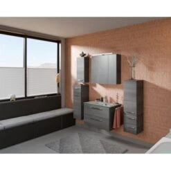 Das Pelipal Badmöbel-Set TrenTino mit Beimöbeln und Glaswaschtisch 137 cm Graphit bietet eine elementare, bestehend aus den drei Kernkomponenten Waschtisch, Waschtischunterschrank Spiegelschrank und als Beimöbel ein Unterschrank und ein Midischrank. Prädestiniert ist TrenTino für die individuelle kleinerer Bäder. Bad-Set bestehend aus