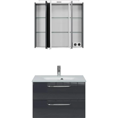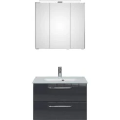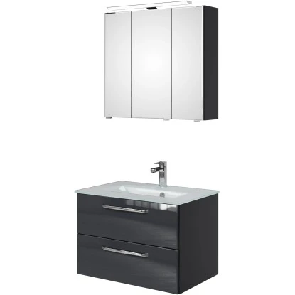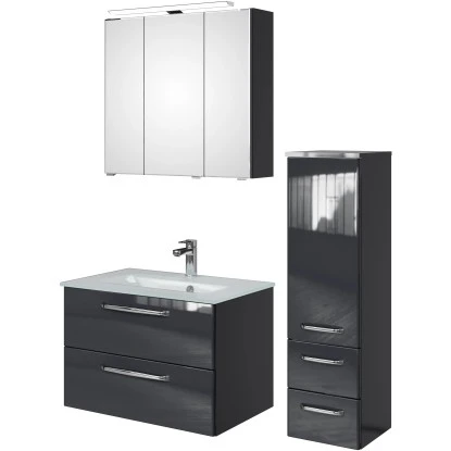 Das Pelipal Badmöbel-Set TrenTino mit Midischrank 107 cm Anthrazit Glanz bietet eine elementare, bestehend aus den drei Kernkomponenten Waschtisch, Waschtischunterschrank, Spiegelschrank und als Beimöbel ein Midischrank. Prädestiniert ist TrenTino für die individuelle kleinerer Bäder. Bad-Set bestehend aus