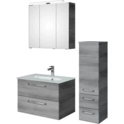 Das Pelipal Badmöbel-Set TrenTino mit Midischrank und Glaswaschtisch 107 cm Graphit bietet eine elementare, bestehend aus den drei Kernkomponenten Waschtisch, Waschtischunterschrank, Spiegelschrank und als Beimöbel ein Midischrank. Prädestiniert ist TrenTino für die individuelle kleinerer Bäder. Bad-Set bestehend aus