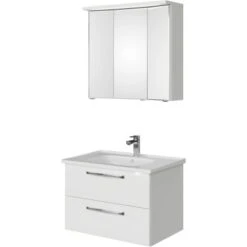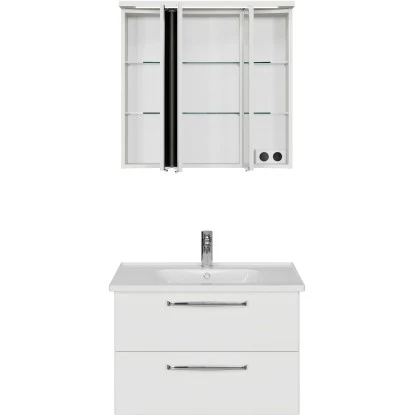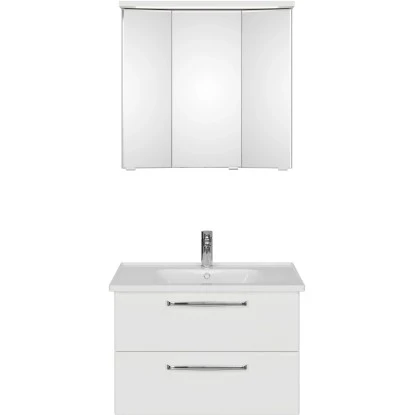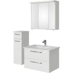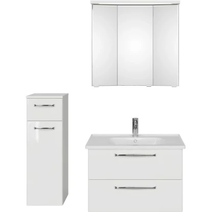 Das Pelipal Badmöbel-Set TrenTino mit Unterschrank und 3D-Spiegelschrank 110 cm Weiß bietet eine elementare, bestehend aus den drei Kernkomponenten Waschtisch, Waschtischunterschrank Spiegelschrank und als Beimöbel ein Midischrank. Prädestiniert ist TrenTino für die individuelle kleinerer Bäder. Bad-Set bestehend aus