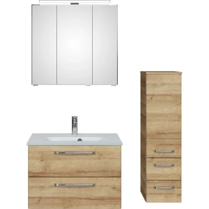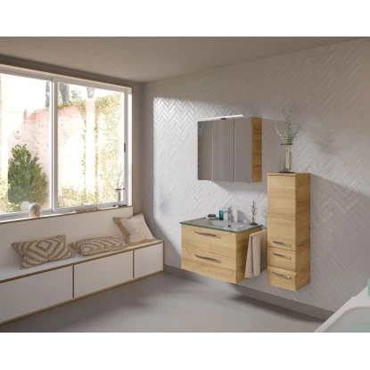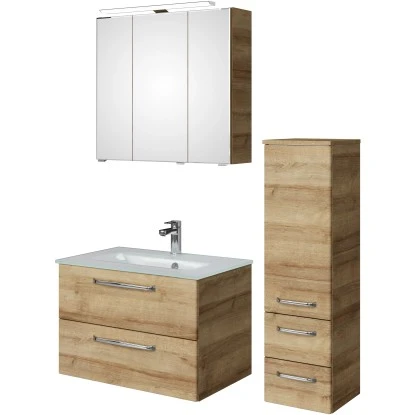 Das Pelipal Badmöbelset TrenTino m. Midischrank + Aufsatzleuch. 107 cm Riviera Eiche bietet eine elementare, bestehend aus den drei Kernkomponenten Waschtisch, Waschtischunterschrank, Spiegelschrank und als Beimöbel ein Midischrank. Prädestiniert ist TrenTino für die individuelle kleinerer Bäder. Bad-Set bestehend aus