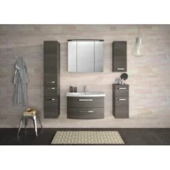 Übersichtliche Auswahl, praktische Handhabung, schnelle Lieferung – dafür steht die Serie 4010. Das Modell 4010 erweist sich dabei als besonders gefällig. Der leicht gewölbte Waschtischunterschrank verleiht, zusammen mit dem großzügigen Keramik-Waschtisch, dem Badezimmer eine sinnliche Anmutung. Individuelle Konstellationen ergeben sich in Kombination mit den passenden Wandschränken, die unkompliziert aus der Übersicht gewählt werden können. Vier verschiedenen Farben, Graphit, Mokka, Weiß Glanz, Sanremo Eiche Terra mit teilweise sichtbarer Querstruktur, bieten eine umfassende Bandbreite, um das Passende zu finden. Die Möbel sind mit einer hochwertigen und Pflegeleichten Folie überzogen. Innen ist Ihr Badmöbel-Set mit weißem Melamin beschichtet: Ideal für eine schnelle Reinigung und weniger Feuchtigkeitsanfällig. Die glänzenden Bügelgriffe in Chrom komplettieren das Gesamtbild harmonisch. Dabei überzeugt die Linie mit funktionalem Nutzen und hoher Qualität – Serie auf 4010.