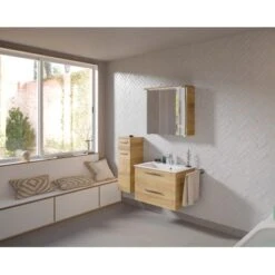 Melaminbeschichtung: Dank der Melaminharzbeschichtung sind Ihre Badmöbel feuchtigkeitsbeständig und pflegeleicht.