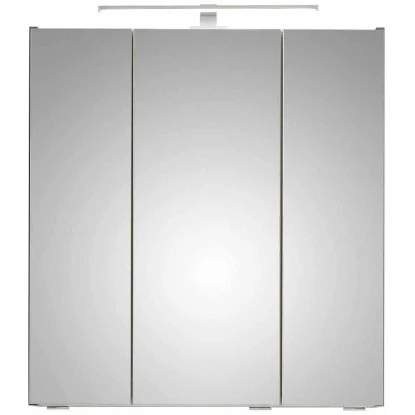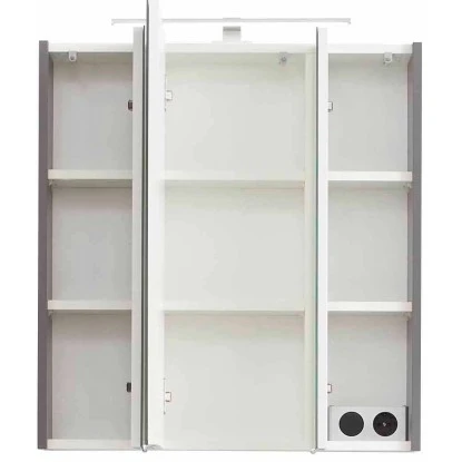 Der moderne Spiegelschrank ist mit drei Türen und sechs Einlegeböden ausgestattet und bietet großzügigen Stauraum für Ihre Badutensilien. Im Inneren befindet sich auch eine praktische Schalter/Steckdosenkombination, die eine einfache Handhabung des Föns & Co. ermöglicht.