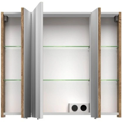 Der moderne Spiegelschrank ist mit drei Türen und sechs Glaseinlegeböden ausgestattet und bietet großzügigen Stauraum für Ihre Badutensilien. Im Inneren befindet sich auch eine praktische Schalter/Steckdosenkombination, die eine einfache Handhabung des Föns und Co. ermöglicht.