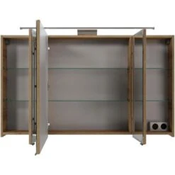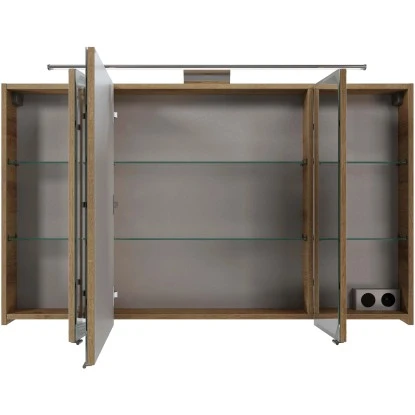 Der moderne Spiegelschrank ist mit drei Türen und sechs Glaseinlegeböden ausgestattet und bietet großzügigen Stauraum für Ihre Badutensilien. Im Inneren befindet sich auch eine praktische Schalter/Steckdosenkombination, die eine einfache Handhabung des Föns & Co. ermöglicht.