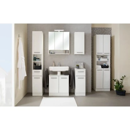 Ein besonders cleanes Ambiente erzeugt die Badmöbelserie Kassel. Die Linie im klassischen Weiß bietet Übersicht und Klarheit. Stylische Akzente setzen die grauen Kanten und Griffe. Die verschiedenen Schrankvarianten erlauben eine individuelle Gestaltung, ausgerichtet nach Platz und Stauraumbedarf. Der Spiegelschrank mit LED-Strahlern hat viel Stauraum und moderne Funktionalität. Praktisch ist hier das offene Fach unter dem Spiegelschrank für den schnellen Zugriff auf oft gebrauchte Badutensilien. Der Waschbeckenunterschrank setzt alle Keramikwaschtische gekonnt in Szene und bietet unerlässlichen Stauraum. Innen ist Ihr Badmöbel-Set mit weißem Melamin beschichtet: Ideal für eine schnelle Reinigung und weniger Feuchtigkeitsanfällig. Unsere Möbel werden von uns nach modernsten Verfahren und Verträglichkeitsstandards hergestellt. Überzeugen Sie sich selbst von der Qualität, trotz günstiger Preise.