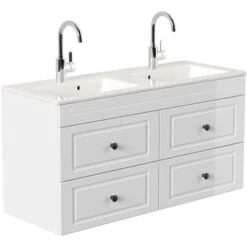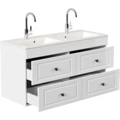Der familienfreundliche Posseik Badmöbel-Set Argos mit Doppelwaschbecken ist im Landhausstil in Weiß hochglanz ein echter Hingucker. Gleichzeitig bietet er genug Stauraum für eine ganze Familie und ermöglicht dank des Doppelbeckens die simultane Nutzung von zwei Personen.