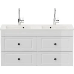 Badmöbel Waschtisch Unterschrank, 4 Schubladen mit Softclose, der Abstand zwischen beiden Abflüssen ist 59cm von Mitte zu Mitte (B/H/T) 119/60/45,6 cm.