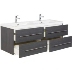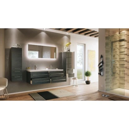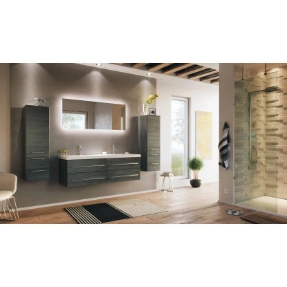 Ein exclusives Badmöbel-Set für gehobene Einrichtungsträume in großen Badezimmern. Während Ihnen der besonders großzügige Doppelwaschplatz ein hohes Maß an Komfort verspricht, stellen die Fronten in Anthrazit Seidenglanz die Hochwertigkeit ebenso gekonnt unter Beweis, wie das Keramikbecken mit klaren Linien und die Schubkästen mit Softclose.