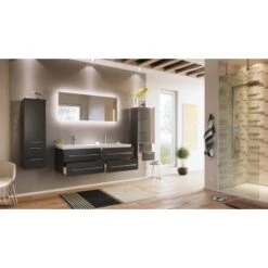 Ein exclusives Badmöbel-Set für gehobene Einrichtungsträume in großen Badezimmern. Während Ihnen der besonders großzügige Doppelwaschplatz ein hohes Maß an Komfort verspricht, stellen die Fronten in Anthrazit Seidenglanz die Hochwertigkeit ebenso gekonnt unter Beweis, wie das Keramikbecken mit klaren Linien und die Schubkästen mit Softclose.