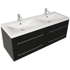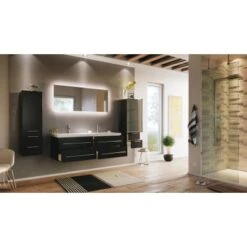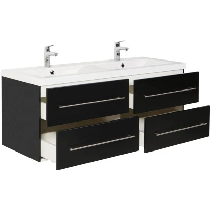Ein exclusives Badmöbel-Set für gehobene Einrichtungsträume in großen Badezimmern. Während Ihnen der besonders großzügige Doppelwaschplatz ein hohes Maß an Komfort verspricht, stellen die Fronten in Anthrazit Seidenglanz die Hochwertigkeit ebenso gekonnt unter Beweis, wie das Keramikbecken mit klaren Linien und die Schubkästen mit Softclose.