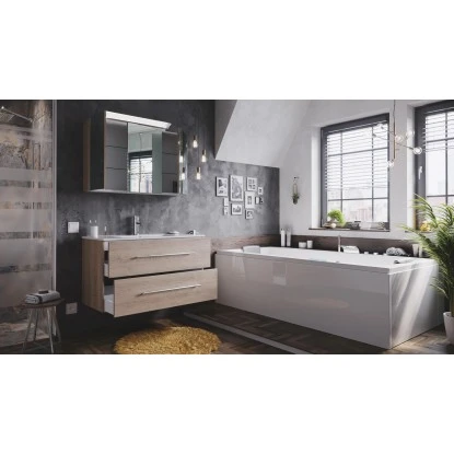 Das 3-teilige Posseik Badmöbel-Set Homeline überzeugt durch das moderne und edle Design in heller Eiche. Die matt gebürsteten Edelstahl-Griffe runden das schöne Gesamtbild optimal ab. Mit diesen Badmöbeln sorgen Sie für ein absolutes Highlight in Ihrem Bad. Das Set verbindet gekonnt dezente Eleganz mit praktischen Eigenschaften. Für ein bemerkenswertes Qualitätsmerkmal sprechen die weichen abgerundeten Kanten und Ecken sowie das Soft-Close-System, wodurch das geräuschlose Schließen der Schubladen und Türen garantiert wird.