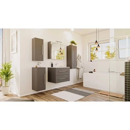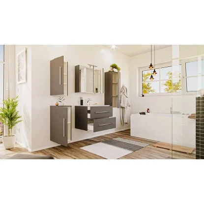 Das 5-teilige Posseik Badmöbel-Set Homeline überzeugt durch das moderne und edle Design in glänzendem Anthrazit. Die matt gebürsteten Edelstahl-Griffe runden das schöne und schlichte Gesamtbild optimal ab. Mit diesen Badmöbeln sorgen Sie für ein absolutes Highlight in Ihrem Bad. Das Set verbindet gekonnt dezente Eleganz mit praktischen Eigenschaften. Für ein bemerkenswertes Qualitätsmerkmal sprechen die weichen abgerundeten Kanten und Ecken sowie das Soft-Close-System, wodurch das geräuschlose Schließen der Schubladen und Türen garantiert wird.