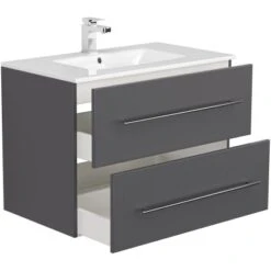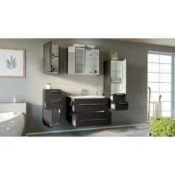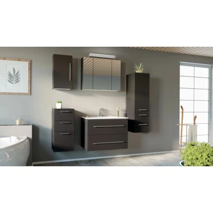 Das 5-teilige Posseik Badmöbel-Set Homeline überzeugt durch das moderne und edle Design in glänzendem Anthrazit. Die matt gebürsteten Edelstahl-Griffe runden das schöne und schlichte Gesamtbild optimal ab. Mit diesen Badmöbeln sorgen Sie für ein absolutes Highlight in Ihrem Bad. Das Set verbindet gekonnt dezente Eleganz mit praktischen Eigenschaften. Für ein bemerkenswertes Qualitätsmerkmal sprechen die weichen abgerundeten Kanten und Ecken sowie das Soft-Close-System, wodurch das geräuschlose Schließen der Schubladen und Türen garantiert wird.