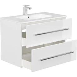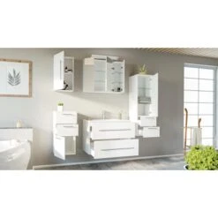 Das 5-teilige Posseik Badmöbel-Set Homeline überzeugt durch das moderne und edle Design in glänzendem Weiß. Die matt gebürsteten Edelstahl-Griffe runden das schöne und schlichte Gesamtbild optimal ab. Mit diesen Badmöbeln sorgen Sie für ein absolutes Highlight in Ihrem Bad. Das Set verbindet gekonnt dezente Eleganz mit praktischen Eigenschaften. Für ein bemerkenswertes Qualitätsmerkmal sprechen die weichen abgerundeten Kanten und Ecken sowie das Soft-Close-System, wodurch das geräuschlose Schließen der Schubladen und Türen garantiert wird.