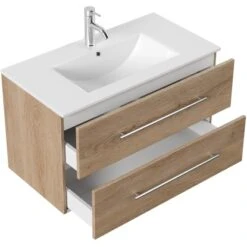 Das 3-teilige Posseik Badmöbel-Set Homeline überzeugt durch das moderne und edle Design in heller Eiche. Die matt gebürsteten Edelstahl-Griffe runden das schöne Gesamtbild optimal ab. Mit diesen Badmöbeln sorgen Sie für ein absolutes Highlight in Ihrem Bad. Das Set verbindet gekonnt dezente Eleganz mit praktischen Eigenschaften. Für ein bemerkenswertes Qualitätsmerkmal sprechen die weichen abgerundeten Kanten und Ecken sowie das Soft-Close-System, wodurch das geräuschlose Schließen der Schubladen und Türen garantiert wird.