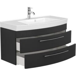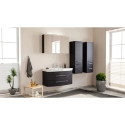 Trotz des enormen Platzangebots wirkt das Badmöbel-Set Luna leicht und schwerelos. Durch die wandhängende Montage wird der Raum optisch nicht erdrückt und die Möbel können ihre unaufdringliche Eleganz entfalten. Zudem sind die Schubladen und Schrankfächer optimal in bequemer Haltung erreichbar und auch die Bodenpflege unter den Badmöbeln gestaltet sich mühelos. Leichten Zugang zu Hygieneartikeln, Kosmetika und Handtüchern verschafft das integrierte Softclose-System. Abgerundete Möbelkanten und eine feuchtigkeitsresistente Schutzbeschichtung erweisen sich im alltäglichen Gebrauch als angenehm nützlich und gewährleisten, ebenso wie das Waschbecken aus flexiblem Mineralguss und die Handgriffe aus gebürstetem Edelstahl, eine lange Lebensdauer. Die Türen des Spiegelschranks sind ebenfalls mit Softclose-Funktion ausgestattet, eine moderne Acrylglaslampe sorgt für gute Ausleuchtung und eine angenehme Atmosphäre.