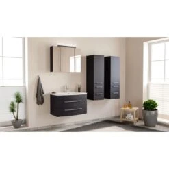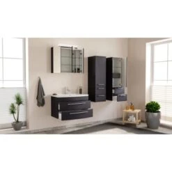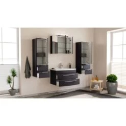 Trotz des enormen Platzangebots wirkt das Badmöbel-Set Luna leicht und schwerelos. Durch die wandhängende Montage wird der Raum optisch nicht erdrückt und die Möbel können ihre unaufdringliche Eleganz entfalten. Zudem sind die Schubladen und Schrankfächer optimal in bequemer Haltung erreichbar und auch die Bodenpflege unter den Badmöbeln gestaltet sich mühelos. Leichten Zugang zu Hygieneartikeln, Kosmetika und Handtüchern verschafft das integrierte Softclose-System. Abgerundete Möbelkanten und eine feuchtigkeitsresistente Schutzbeschichtung erweisen sich im alltäglichen Gebrauch als angenehm nützlich und gewährleisten, ebenso wie das Waschbecken aus flexiblem Mineralguss und die Handgriffe aus gebürstetem Edelstahl, eine lange Lebensdauer. Die Türen des Spiegelschranks sind ebenfalls mit Softclose-Funktion ausgestattet, eine moderne Acrylglaslampe sorgt für gute Ausleuchtung und eine angenehme Atmosphäre.