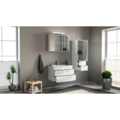 Trotz des enormen Platzangebots wirkt das Badmöbel-Set Luna leicht und schwerelos. Durch die wandhängende Montage wird der Raum optisch nicht erdrückt und die Möbel können ihre unaufdringliche Eleganz entfalten. Zudem sind die Schubladen und Schrankfächer optimal in bequemer Haltung erreichbar und auch die Bodenpflege unter den Badmöbeln gestaltet sich mühelos. Leichten Zugang zu Hygieneartikeln, Kosmetika und Handtüchern verschafft das integrierte Softclose-System. Abgerundete Möbelkanten und eine feuchtigkeitsresistente Schutzbeschichtung erweisen sich im alltäglichen Gebrauch als angenehm nützlich und gewährleisten, ebenso wie das Waschbecken aus flexiblem Mineralguss und die Handgriffe aus gebürstetem Edelstahl, eine lange Lebensdauer. Die Türen des Spiegelschranks sind ebenfalls mit Softclose-Funktion ausgestattet, eine moderne Acrylglaslampe sorgt für gute Ausleuchtung und eine angenehme Atmosphäre.