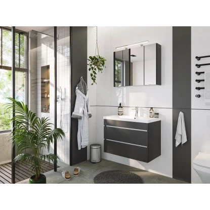 Das 2-teilige Posseik Badmöbel Set Pero Graphit bringt Stil und Stauraum in Ihr Badezimmer. Dank der Schubladen und dem Spiegelschrank können Sie all ihre Hygieneartikel oder Handtücher gut unterbringen. Gleichzeitig bietet die hochwertige SoftTouch Beschichtung eine widerstandsfähige Oberfläche.
