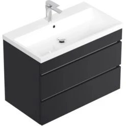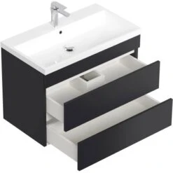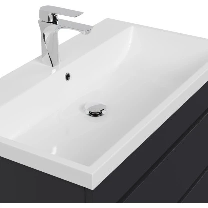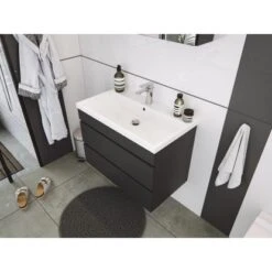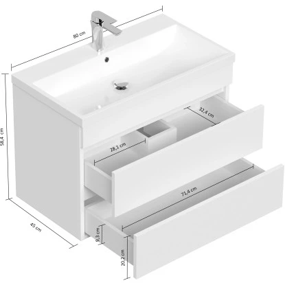 Der ebenfalls im Set enthaltene Unterschrank mit den Maßen 79 cm x 54,4 cm x 44,5 cm (H/B/T) verfügt über zwei geräumige Softclose-Schubladen. Das Mineralguss Waschbecken ist mit Überlauf ausgestattet und hat die Abmessungen 80,5 cm x 4 cm x 45,3 cm (B/H/T).