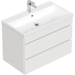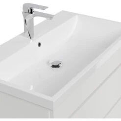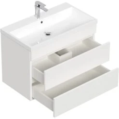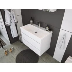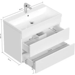 Der ebenfalls im Set enthaltene Unterschrank mit den Maßen 79 cm x 54,4 cm x 44,5 cm (H/B/T) verfügt über zwei geräumige Softclose-Schubladen. Das Mineralguss Waschbecken ist mit Überlauf ausgestattet und hat die Abmessungen 80,5 cm x 4 cm x 45,3 cm (B/H/T).