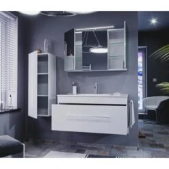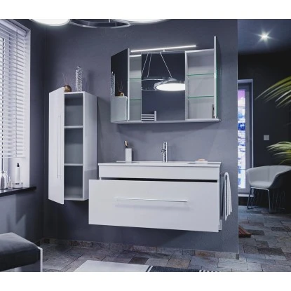 Das Badmöbel-Set Pro besteht aus einem Waschbeckenunterschrank mit Waschtisch, einem Spiegelschrank mit Beleuchtung und einem Hochschrank. Die Badkombination besticht durch eine edle Optik in Weiß Hochglanz und verleiht Ihrem Bad einen luxuriösen Look. Griffe aus schwerem, matt gebürsteten Edelstahl runden das elegante Design gekonnt ab. Das geräumige Badezimmermöbel-Set eignet sich vor allem für große Bäder.