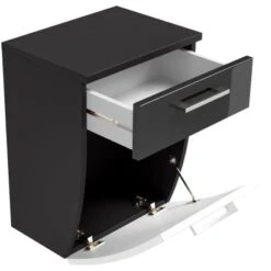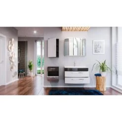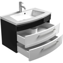 Ein exquisites Badmöbel-Set für gehobene Einrichtungsträume. Das 5-teilige Posseik Badmöbel-Set Rima in der Ausführung Anthrazit-Weiß lässt keine Wünsche offen und avanciert mit einer attraktiven Formgebung zu einem wunderschönen Blickfang in Ihrem Badezimmer. Während Ihnen das besonders großzügige Waschbecken ein hohes Maß an Komfort verspricht, stellen die hochglänzenden Fronten die Hochwertigkeit ebenso gekonnt unter Beweis, wie die verchromten Metallgriffe und Schubkästen mit Softeinzug.