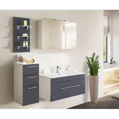 Das Badmöbel-Set Viva zeichnet sich durch modernes Design und hochwertige Qualität aus. Die Serie ist in verschiedenen Farben erhältlich und bietet tolle Kombinationsmöglichkeiten. Das formschöne Keramikwaschbecken ist pflegeleicht und wird einfach auf den Waschbeckenunterschrank aufgesetzt. Die Fronten der Möbel sind auch über die Kanten und Ecken mit einer hochwertigen Beschichtung versehen. Die weichen Kanten verleihen dieser Möbelserie eine schöne 3D-Optik. Der Korpus ist in Weiß matt gehalten während für die Fronten sowohl die Farben Weiß Hochglanz, Schwarz und Anthrazit als auch eine edle Betonoptik zur Auswahl stehen. Die Schubladen und ggf. Türen schließen mit der bequemen Soft-Close-Funktion und ziehen sich selbstständig auf den letzten Zentimetern sanft ein.