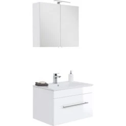Ummantelt ist das Badmöbelset Made in Germany mit einer Markenbeschichtung der Firma Renolit und mit ökologischen Kleber der Firma Henkel verarbeitet. Innen sind die Schränke und Schubladen mit weißem Melamin beschichtet: Ideal für eine schnelle Reinigung.