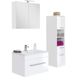 Ummantelt ist das Badmöbelset Made in Germany mit einer Markenbeschichtung der Firma Renolit und mit ökologischen Kleber der Firma Henkel verarbeitet. Innen sind die Schränke und Schubladen mit weißem Melamin beschichtet: Ideal für eine schnelle Reinigung.