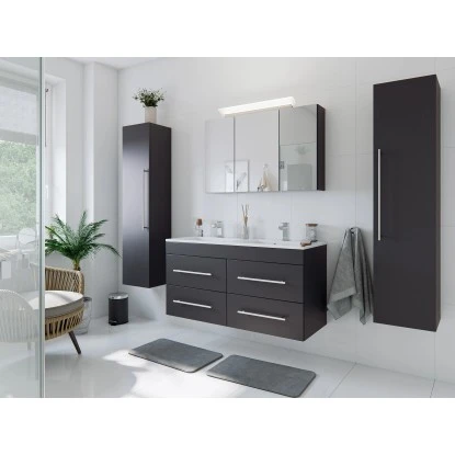 Ein exklusives Badmöbel-Set für gehobene Einrichtungsträume in großen Badezimmern. Während Ihnen der besonders großzügige Doppelwaschplatz ein hohes Maß an Komfort verspricht, stellen die Fronten in Weiss Hochglanz die Hochwertigkeit ebenso gekonnt unter Beweis, wie das Keramikbecken mit klaren Linien und die Schubkästen mit Softclose.