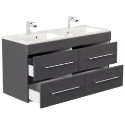 Das Posseik Doppelwaschbecken in Anthrazit ist eine elegante Kombination aus einem Doppelwaschbecken und Waschbeckenunterschrank für Ihre Badezimmereinrichtung. Auf 120 cm Breite mit vier Schubladen und zwei Waschbecken bietet der Waschplatz ausreichend Platz für die tägliche Pflege.