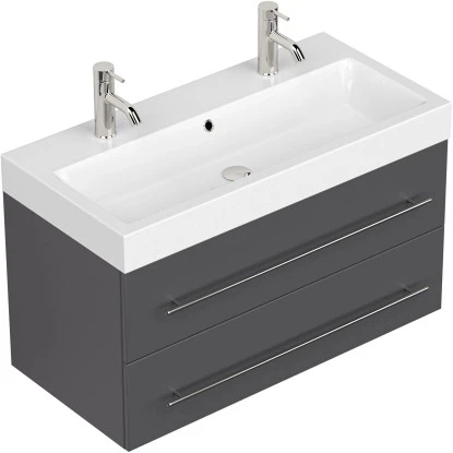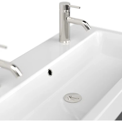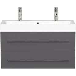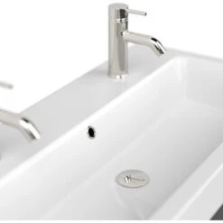 Der Posseik Doppelwaschtisch Livono überzeugt mit der Kombination eines hochwertigen Waschbeckens mit einem praktischen Unterschrank.DasKeramik-Waschbecken ist in einem modernen, eckigen Design gestaltet. Mit seinem breiten Rand bietet es Abstellflächen auf allen Seiten. In den Waschtisch integriert ist ein Überlaufloch, dass das Überlaufen des Waschbeckens verhindert.Das Waschbecken ist in einen praktischenUnterschrank eingefügt. Dieser führt die modernen, eckigen Formen des Beckens fort. Das Badmöbel verfügt über drei Türen mit Soft-Close-Systemen für schonenderes Schließen. Der Waschbeckenunterschrank ist aus MDF gefertigt und in den Innenraum mit Melamin beschichtet. So ist er besonders feuchtigkeitsresistent und zudem leicht zu reinigen. Die Handgriffe sind aus matt gebürstetem Edelstahl.