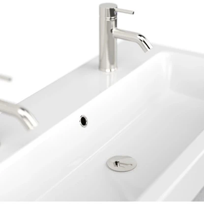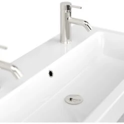 Der Posseik Doppelwaschtisch Livono überzeugt mit der Kombination eines hochwertigen Waschbeckens mit einem praktischen Unterschrank.DasKeramik-Waschbecken ist in einem modernen, eckigen Design gestaltet. Mit seinem breiten Rand bietet es Abstellflächen auf allen Seiten. In den Waschtisch integriert ist ein Überlaufloch, dass das Überlaufen des Waschbeckens verhindert.Das Waschbecken ist in einen praktischenUnterschrank eingefügt. Dieser führt die modernen, eckigen Formen des Beckens fort. Das Badmöbel verfügt über drei Türen mit Soft-Close-Systemen für schonenderes Schließen. Der Waschbeckenunterschrank ist aus MDF gefertigt und in den Innenraum mit Melamin beschichtet. So ist er besonders feuchtigkeitsresistent und zudem leicht zu reinigen. Die Handgriffe sind aus matt gebürstetem Edelstahl.