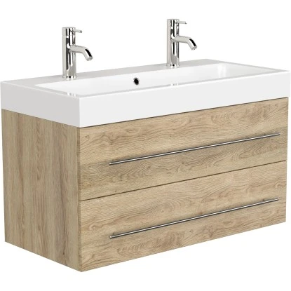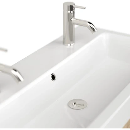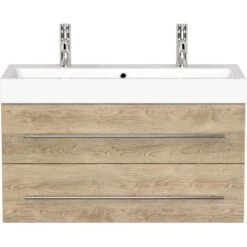 Der Posseik Doppelwaschtisch Livono überzeugt mit der Kombination eines hochwertigen Waschbeckens mit einem praktischen Unterschrank.DasKeramik-Waschbecken ist in einem modernen, eckigen Design gestaltet. Mit seinem breiten Rand bietet es Abstellflächen auf allen Seiten. In den Waschtisch integriert ist ein Überlaufloch, dass das Überlaufen des Waschbeckens verhindert.Das Waschbecken ist in einen praktischenUnterschrank eingefügt. Dieser führt die modernen, eckigen Formen des Beckens fort. Das Badmöbel verfügt über drei Türen mit Soft-Close-Systemen für schonenderes Schließen. Der Waschbeckenunterschrank ist aus MDF gefertigt und in den Innenraum mit Melamin beschichtet. So ist er besonders feuchtigkeitsresistent und zudem leicht zu reinigen. Die Handgriffe sind aus matt gebürstetem Edelstahl.