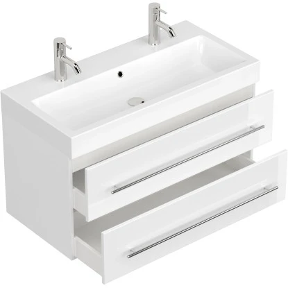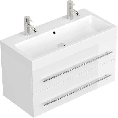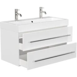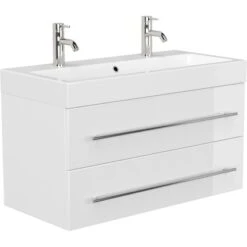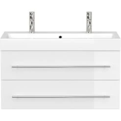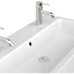Der Posseik Doppelwaschtisch Livono überzeugt mit der Kombination eines hochwertigen Waschbeckens mit einem praktischen Unterschrank.DasKeramik-Waschbecken ist in einem modernen, eckigen Design gestaltet. Mit seinem breiten Rand bietet es Abstellflächen auf allen Seiten. In den Waschtisch integriert ist ein Überlaufloch, dass das Überlaufen des Waschbeckens verhindert.Das Waschbecken ist in einen praktischenUnterschrank eingefügt. Dieser führt die modernen, eckigen Formen des Beckens fort. Das Badmöbel verfügt über drei Türen mit Soft-Close-Systemen für schonenderes Schließen. Der Waschbeckenunterschrank ist aus MDF gefertigt und in den Innenraum mit Melamin beschichtet. So ist er besonders feuchtigkeitsresistent und zudem leicht zu reinigen. Die Handgriffe sind aus matt gebürstetem Edelstahl.