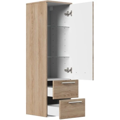 Dieser Schrank ist mit einem Echtmetallgriff einer Klappe und einer Schublade ausgestattet. Außerdem verfügt er über eine große Türe, hinter der Stauraum durch zwei Einlegeböden aufgeteilt werden kann, diese bietet Anschlagsdämpfung. Durch den geschwungenen Unterbau sowie die hochwertigen Hochglanz MDF-Fronten bietet er einen exklusiven Blickfang für Ihr Bad.