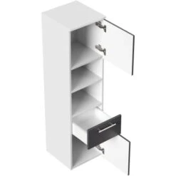 Das Badmöbel-Set Viva zeichnet sich durch modernes Design und hochwertige Qualität aus. Die Serie ist in verschiedenen Farben erhältlich und bietet tolle Kombinationsmöglichkeiten. Die Fronten der Möbel sind auch über die Kanten und Ecken mit einer hochwertigen Beschichtung versehen. Die weichen Kanten verleihen dieser Möbelserie eine schöne 3D-Optik. Der Korpus ist in Weiß matt gehalten während für die Fronten sowohl die Farben Weiß Hochglanz, Schwarz und Anthrazit als auch eine edle Betonoptik zur Auswahl stehen. Der Hochschrank ist die ideale Ergänzung zu Ihr Badmöbel-Set Viva.