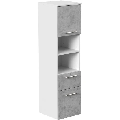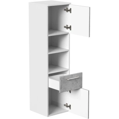 Das Badmöbel-Set Viva zeichnet sich durch modernes Design und hochwertige Qualität aus. Die Serie ist in verschiedenen Farben erhältlich und bietet tolle Kombinationsmöglichkeiten. Die Fronten der Möbel sind auch über die Kanten und Ecken mit einer hochwertigen Beschichtung versehen. Die weichen Kanten verleihen dieser Möbelserie eine schöne 3D-Optik. Der Korpus ist in Weiß matt gehalten während für die Fronten sowohl die Farben Weiß Hochglanz, Schwarz und Anthrazit als auch eine edle Betonoptik zur Auswahl stehen. Der Hochschrank ist die ideale Ergänzung zu Ihr Badmöbel-Set Viva.