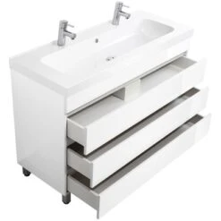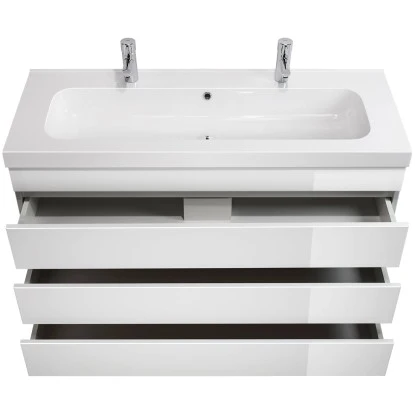 Beim Stand-Doppel-Waschplatz Metis 120 wurde nichts dem Zufall überlassen. Darum wurde das Badmöbel nicht mit einer oder zwei, sondern gleich 3 Softclose Schubladen ausgestattet, die sich grifflos von Ihnen befüllen lassen. Sie werden staunen, wie viele Handtücher, Haargummis, Schminke oder Duschzeug Sie in den Schubladen unterbringen können. Herumliegende Dinge im Badezimmer gehören nun der Vergangenheit an. Ebenso zur Planung gehört eine wasserabweisende Oberfläche, die über den Waschtisch und das Mineralguss Waschbecken gezogen wurde, diese stabilisiert das Möbelstück zum einen, macht das Badmöbel jedoch auch robuster gegenüber unschönen Wasserspuren, da Wasser einfach abperlt. Ihr Badmöbel bleibt Ihnen insgesamt länger erhalten und erstrahlt unter Ihrer Pflege, in dem Sie einfach einen Schwamm und warmes Wasser verwenden.