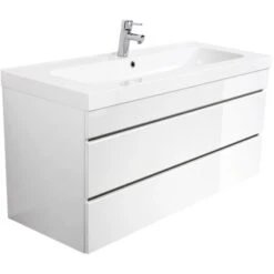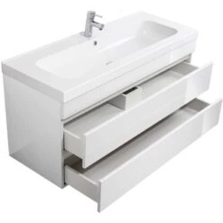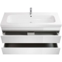Wenn Sie nach einem Badmöbel Ausschau halten, welches Qualität, Klasse und schickes Design vereint, ist das Metis 120 eine nähere Betrachtung wert: in glänzendem, strahlendem Weiß macht der Waschtisch seine Aufwartung. Gleich 2 Softclose Schubladen, die sanft und leise schließen und sich grifflos leicht öffnen lassen, sorgen für genügend Stauraum und Platz. Direkt auf dem Waschtisch sitzt das leicht nach innen gerundete Mineralguss Waschbecken auf. Mit der ebenfalls weißen Farbe und einem breiten Rand, steht das Badmöbel ganz weit oben, wenn es um Möbel für Ihr großes Badezimmer oder Gäste-WC geht.