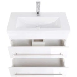 Setzen Sie mit dem Posseik Waschtisch Vela in Weiß Hochglanz neue Akzente in Ihrem Badezimmer. Bringen Sie sowohl einen Hauch Moderne, aber auch die Klassik in Ihr Badezimmer. Dafür sorgt zum einen das Keramik Waschbecken, welches in Weiß Hochglanz geradezu strahlt und mit einer tiefen, leicht nach innen gebogenen Form überrascht. Nutzen Sie den betont breiten Rand des Waschbeckens, um einen hübschen Seifenspender oder eine Handseifenschale aufzustellen. Der Waschtisch harmoniert Ton in Ton mit dem Keramik Waschbecken, ebenfalls in Weiß und lässt dieses Badmöbel sehr edel und hochwertig wirken. Auch die Handgriffe aus matt gebürstetem Edelstahl, die an den zwei Softclose Schubladen befestigt sind, tragen zur Leichtigkeit des gesamten Möbelstücks bei, welches sich problemlos in kleinere und mittelgroße Badezimmer integrieren lässt.