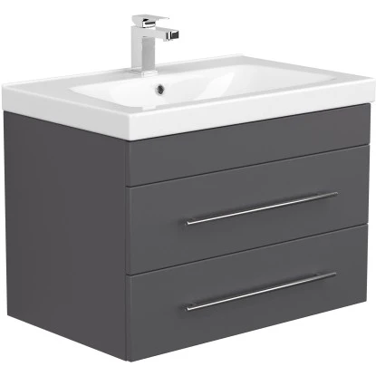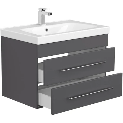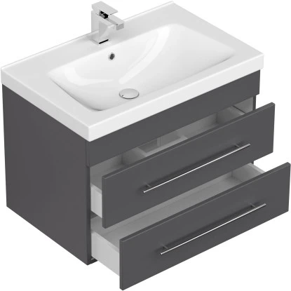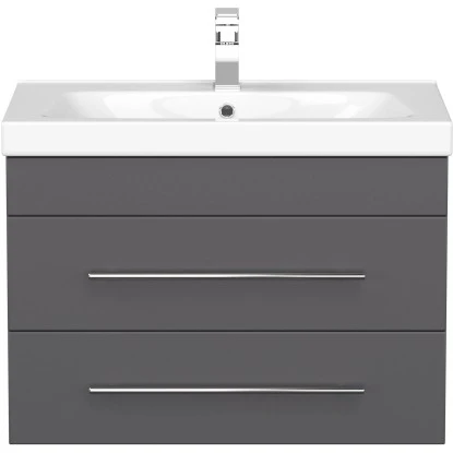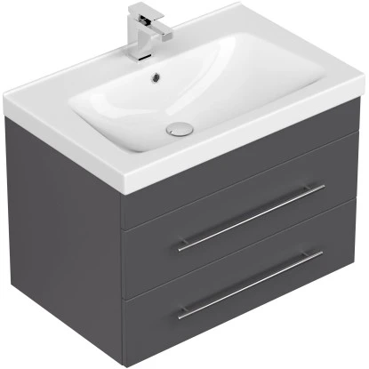 Das Badezimmermöbel Joy 75 überzeugt durch die exzellent gelungene Kombination aus präziser Verarbeitung, hochwertiger Materialqualität und moderner Optik. 2 Soft-Close-Schubladen mit edlen Handgriffen aus gebürstetem Edelstahl erlauben komfortable Handhabung im dynamischen Alltag. Der hochwertige Waschplatz Joy 75 setzt sich aus einem Mineralguss Waschbecken und einem praktischen Schrank zusammen. Angefertigt aus MDF bietet der Unterschrank optimierte Widerstandsfähigkeit und eine lange Lebensdauer. 2 großzügige Schubladen sind im Waschtisch integriert. Ihre modernen Soft-Close Mechanismen erlauben einen besonders bequemen und weichen Einzug. Massive Griffe aus matt gebürstetem Edelstahl perfektionieren das attraktive Design des stilvollen Badmöbels.