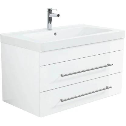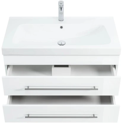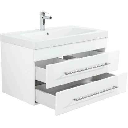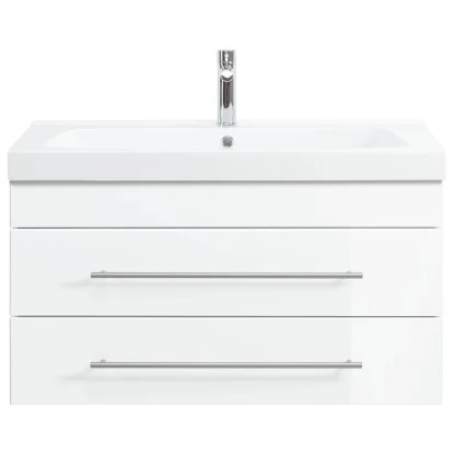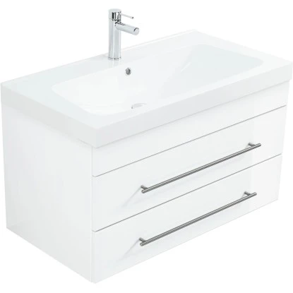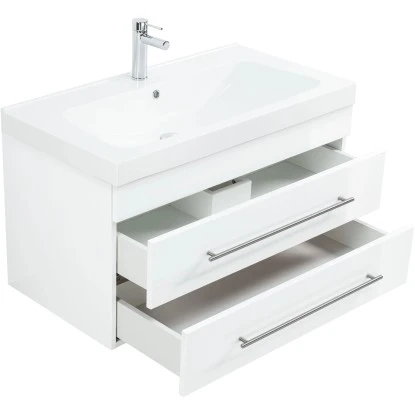 Das Badezimmermöbel Joy 90 offenbart einen trendstarken Look und lässt sich durch die Gestaltung äußerst flexibel kombinieren. Im modernen Badezimmer dient der schöne Waschplatz als wahres Stauraumtalent. Durch den praktischen Schrank mit 2 geräumigen Schubladen bietet das Badmöbel viel Platz für Kosmetik, Reinigungs- und Pflegeutensilien. Moderne Soft-Close-Schienen sorgen für die kinderleichte Handhabung der Schubladen. Angefertigt aus MDF bietet der Unterschrank optimierte Widerstandsfähigkeit und eine lange Lebensdauer. Massive Griffe aus gebürstetem Edelstahl perfektionieren das attraktive Design des stilvollen Badmöbels. Ihr neuer Waschtisch besteht aus 16 mm MDF Made in Germany (mitteldichte Holzfaserplatte). Von Außen ist Ihr neuer Waschplatz mit einer Markenbeschichtung Made in Germany ummantelt und mit ökologischen Kleber verarbeitet. Innen ist Ihr Waschplatz mit weißem Melamin beschichtet: Ideal für eine schnelle Reinigung.