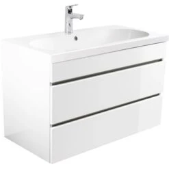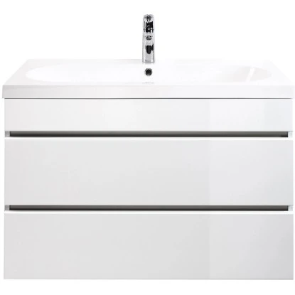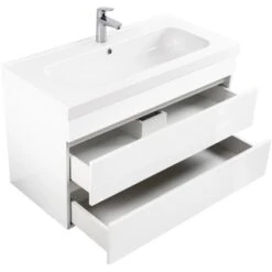 Wenn Sie nach einem Badmöbel Ausschau halten, welches Qualität, Klasse und schickes Design vereint, ist das Metis 90 eine nähere Betrachtung wert: in glänzendem, strahlendem Weiß macht der Waschtisch seine Aufwartung. Gleich 2 Softclose Schubladen, die sanft und leise schließen und sich grifflos leicht öffnen lassen, sorgen für genügend Stauraum und Platz. Direkt auf dem Waschtisch sitzt das leicht nach innen gerundete Mineralguss Waschbecken auf. Mit der ebenfalls weißen Farbe und einem breiten Rand, steht das Badmöbel ganz weit oben, wenn es um Möbel für Ihr großes Badezimmer oder Gäste-WC geht.